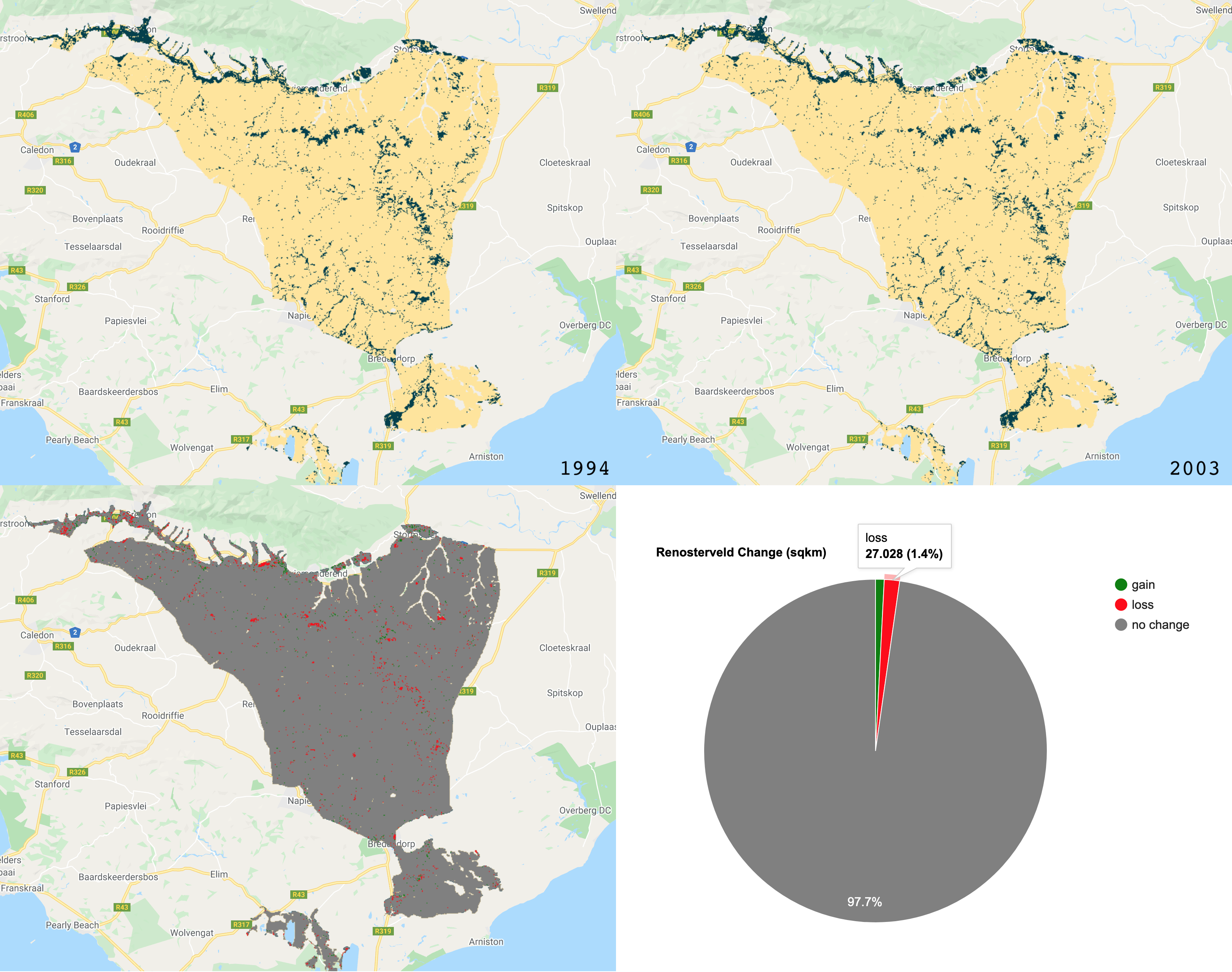 /////////////////////////////////////////////////////// /// Visualisation ///////////////////////////////////// /////////////////////////////////////////////////////// // Creat a palette for the NDVI layer var palette = palettes.crameri.bamako[10].reverse(); // Add the layers to the map // RGB images Map.addLayer(Image_1994, {bands: ['RED', 'GREEN', 'BLUE'], min:0, max:0.3}, 'image 1994 RGB', false) Map.addLayer(Image_2003, {bands: ['RED', 'GREEN', 'BLUE'], min:0, max:0.3}, 'image 2003 RGB', false) // NDVI layers Map.addLayer(Image_1994, {bands: 'NDVI', min: 0, max: 1, palette: palette}, 'image 1994 NDVI', false) Map.addLayer(Image_2003, {bands: 'NDVI', min: 0, max: 1, palette: palette}, 'image 2003 NDVI', false) // Classifications Map.addLayer(Classification_1994, {min: 0, max: 1, palette: ['FFE599','00404D']}, 'classification 1994', false) Map.addLayer(Classification_2003, {min: 0, max: 1, palette: ['FFE599','00404D']}, 'classification 2003', false) ///////////////////////////// // Simple Binary Change ///// ///////////////////////////// // Subtract the 2003 classification from the 1993 classification var coverChange = testClassification_2003.subtract(testClassification_1994); // Add the layer to the map. Red = loss; Grey = no change; Green = gain Map.addLayer(coverChange,{palette: ['red','grey','green'], min: -1, max: 1},'Renosterveld Cover Change 1994-2003',false); // Let's create a chart of the area of each class var labels =[ 'gain','no change','loss' ]; var areaClass = coverChange.eq([1, 0, -1]).rename(labels); // Calculate the area for each pixel var areaEstimate = areaClass.multiply(ee.Image.pixelArea()).divide(1e6); // Set up the chart var chart = ui.Chart.image.regions({ image: areaEstimate, regions: studyRegion, reducer: ee.Reducer.sum(), scale: 1000, }).setChartType('PieChart').setOptions({ width: 250, height: 350, title: 'Renosterveld Change (sqkm)', // is3D: true, colors: ['green','red','grey'], }); print(chart);