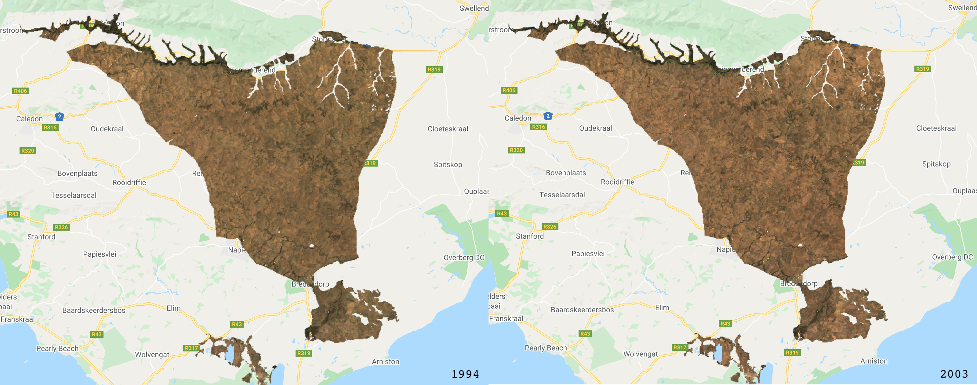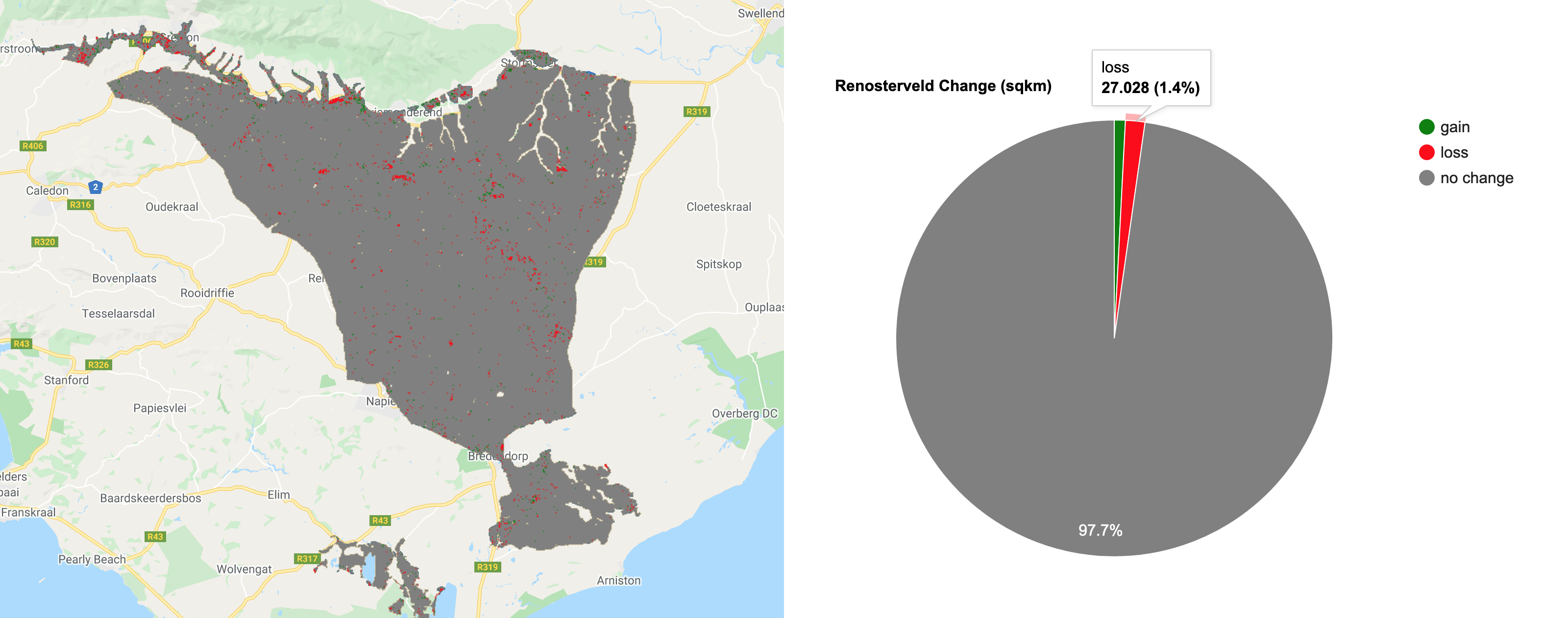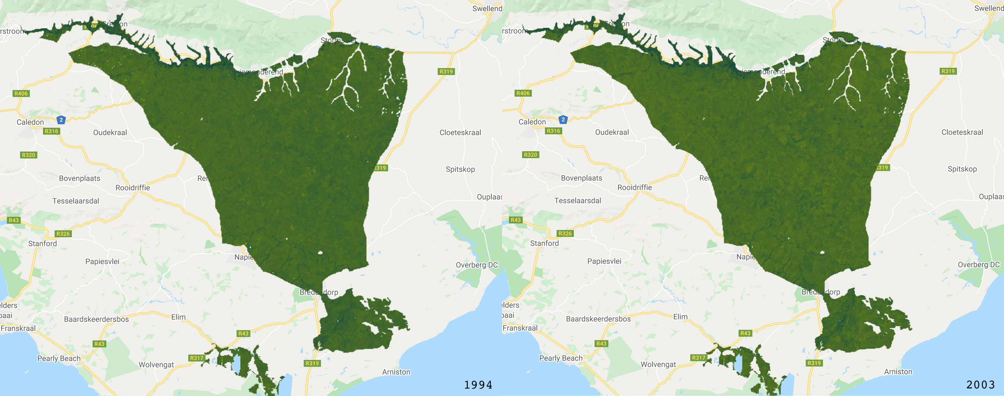 For many land cover change analyses, particularly in forest detection, we have previously relied on annual (or longer interval) land classifications. This includes datasets such as Hansen Global Forest Change or Global Forest Cover Change. These data are immensely valuable and do a good job at compensating for difficulties in monitoring forests in regions with lots of clouds. However, there are limitations to understanding land cover change, when we only have a few observation epochs. This is where Continuous Change Detection and Classification comes in. Using all available satellite observations, the CCDC algorithm provides a more comprehensive approach to classifying images and detecting change. This practical gives an overview of this within the context of a critically endangered Mediterranean-type Ecosystem in southwestern South Africa, known as Renosterveld.