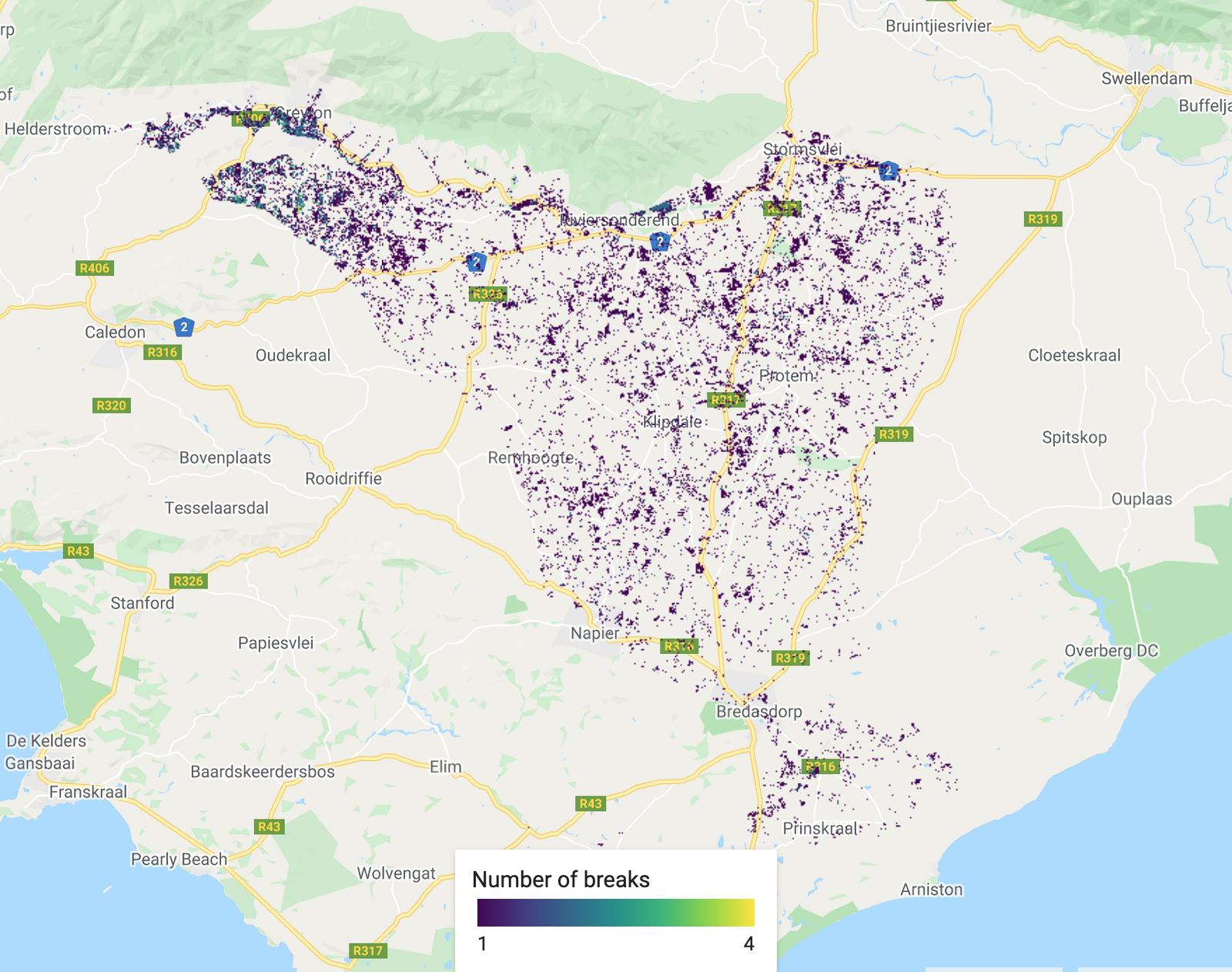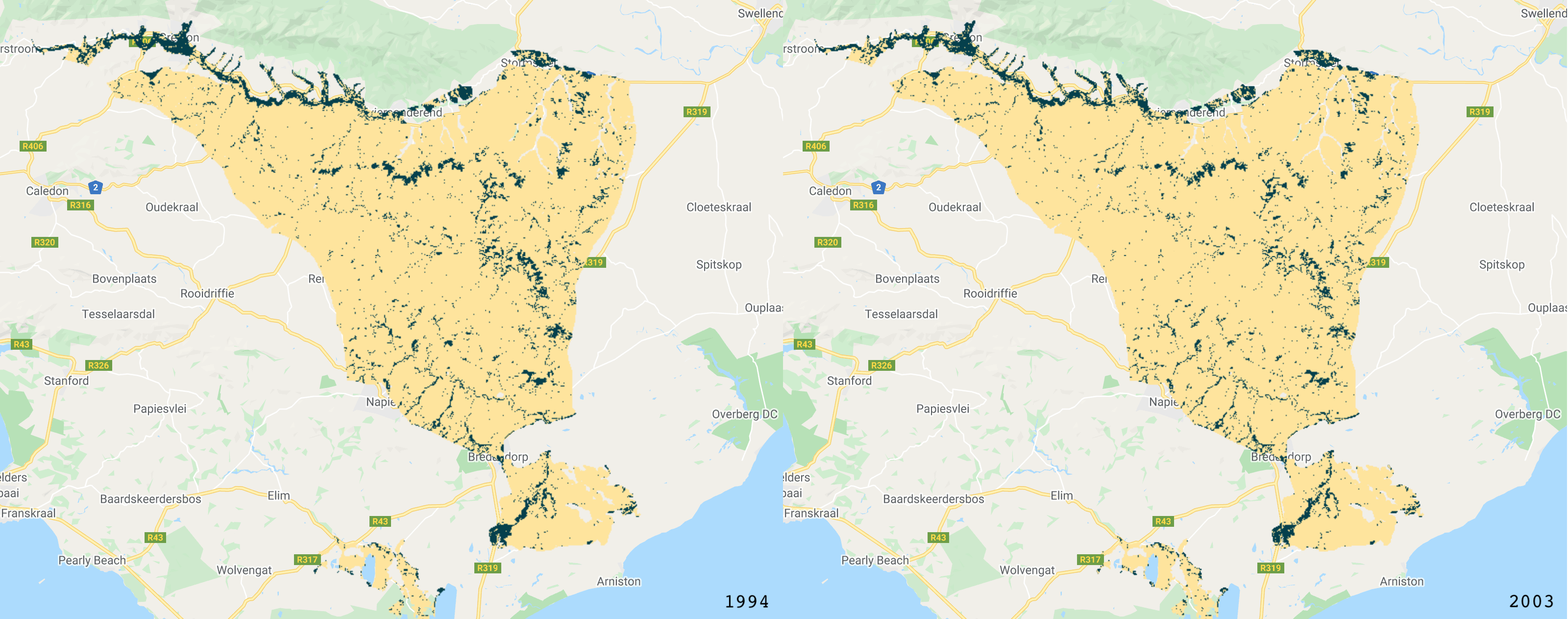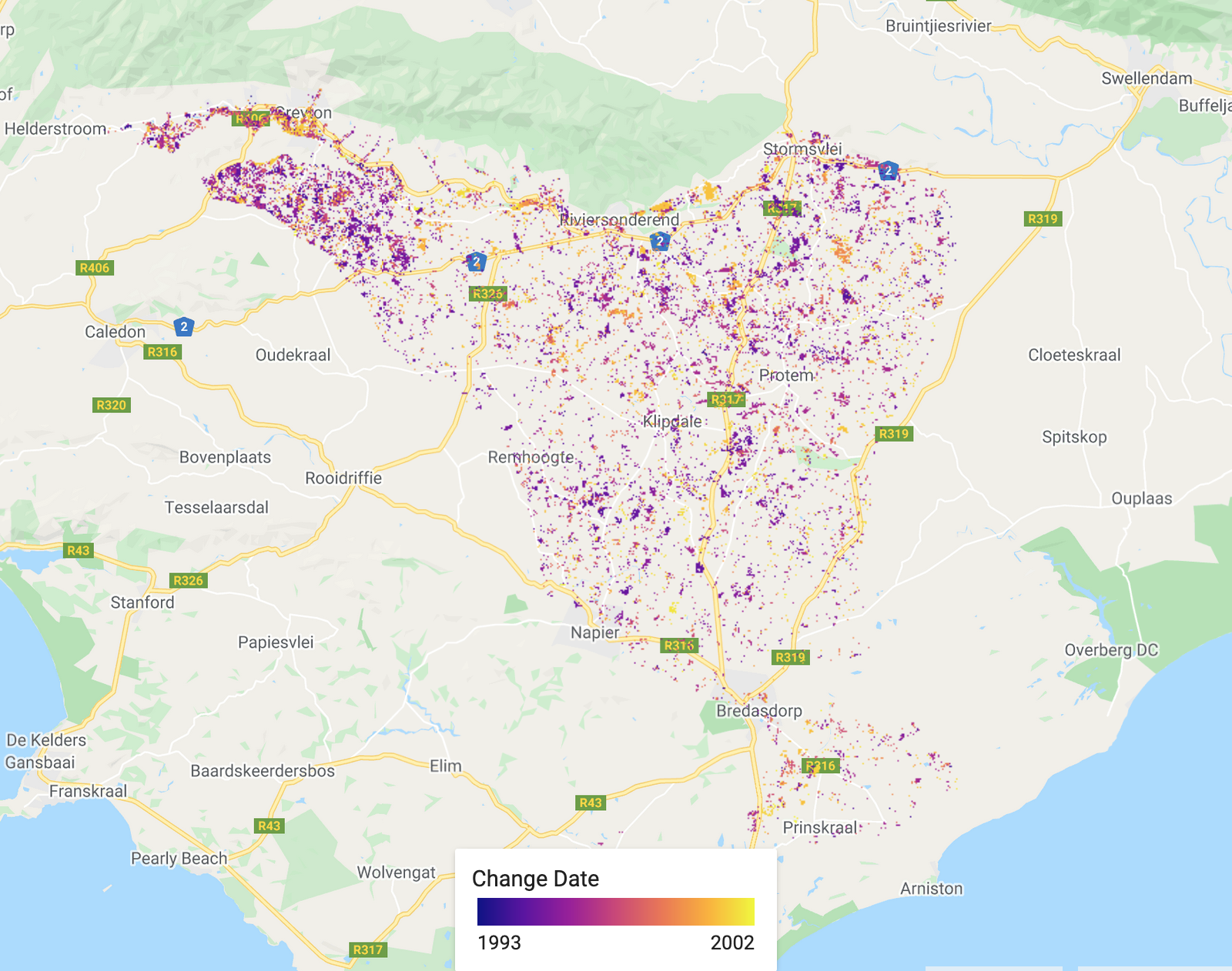 For many land cover change analyses, particularly in forest detection, we have previously relied on annual (or longer interval) land classifications. This includes datasets such as Hansen Global Forest Change or Global Forest Cover Change. These data are immensely valuable and do a good job at compensating for difficulties in monitoring forests in regions with lots of clouds. However, there are limitations to understanding land cover change, when we only have a few observation epochs. This is where Continuous Change Detection and Classification comes in. Using all available satellite observations, the CCDC algorithm provides a more comprehensive approach to classifying images and detecting change. This practical gives an overview of this within the context of a critically endangered Mediterranean-type Ecosystem in southwestern South Africa, known as Renosterveld.