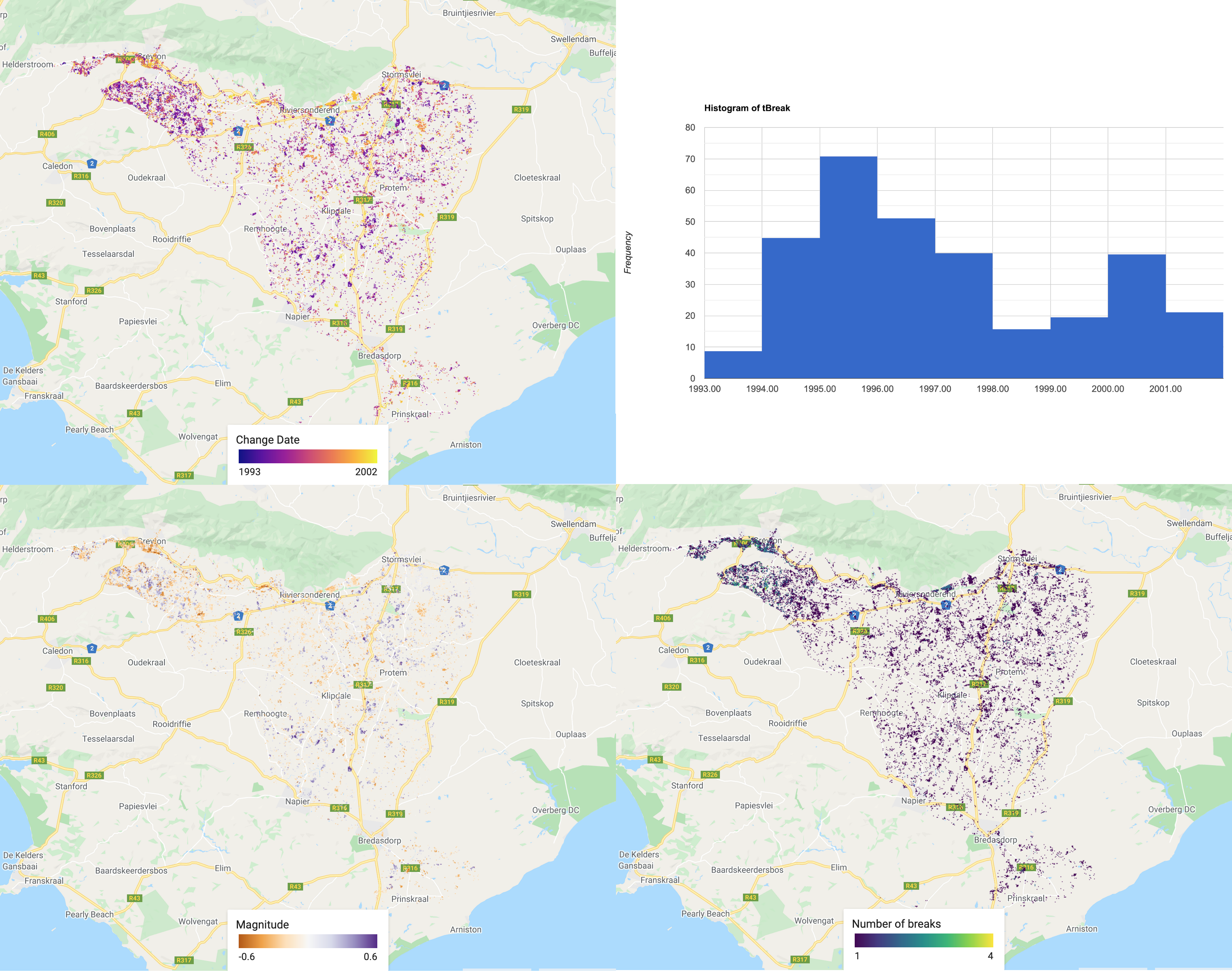 /////////////////////////////////////////// ///// Visualisation /////////////////////// /////////////////////////////////////////// // A chosen palette var change_date_palette = palettes.matplotlib.plasma[7]; var mag_palette = palettes.colorbrewer.PiYG[7]; var num_breaks_palette = palettes.crameri.buda[10]; // Convert millis to fractional year // divide by no. of millis in one year; add on 1970 as baseline var tBreak = filteredChanges.select('tBreak').divide(31556952000).add(1970) // The time of break Map.addLayer(tBreak, {min: 1993, max: 2002, palette: change_date_palette}, 'Change date'); // The magnitude of break Map.addLayer(filteredChanges.select('MAG'), {min: -0.6, max: 0.6, palette: mag_palette}, 'Magnitude'); // The number of breaks Map.addLayer(filteredChanges.select('numTbreak'), {min: 1, max: 4, palette: num_breaks_palette}, 'Number of breaks'); // Histogram of date of change // Make sure you have your original study region defined var hist = ui.Chart.image.histogram({ image:tBreak, region:studyRegion, minBucketWidth: 1, scale: 1000, }) print(hist); // Add in legend for aid in visualisation