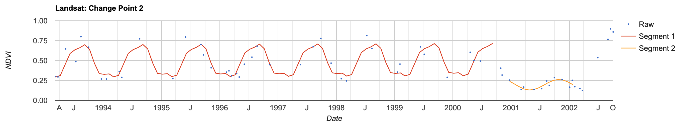 In this chart, the CCDC algorithm suggests there was a change in land cover around late 2000. The y-axis shows changes in NDVI.