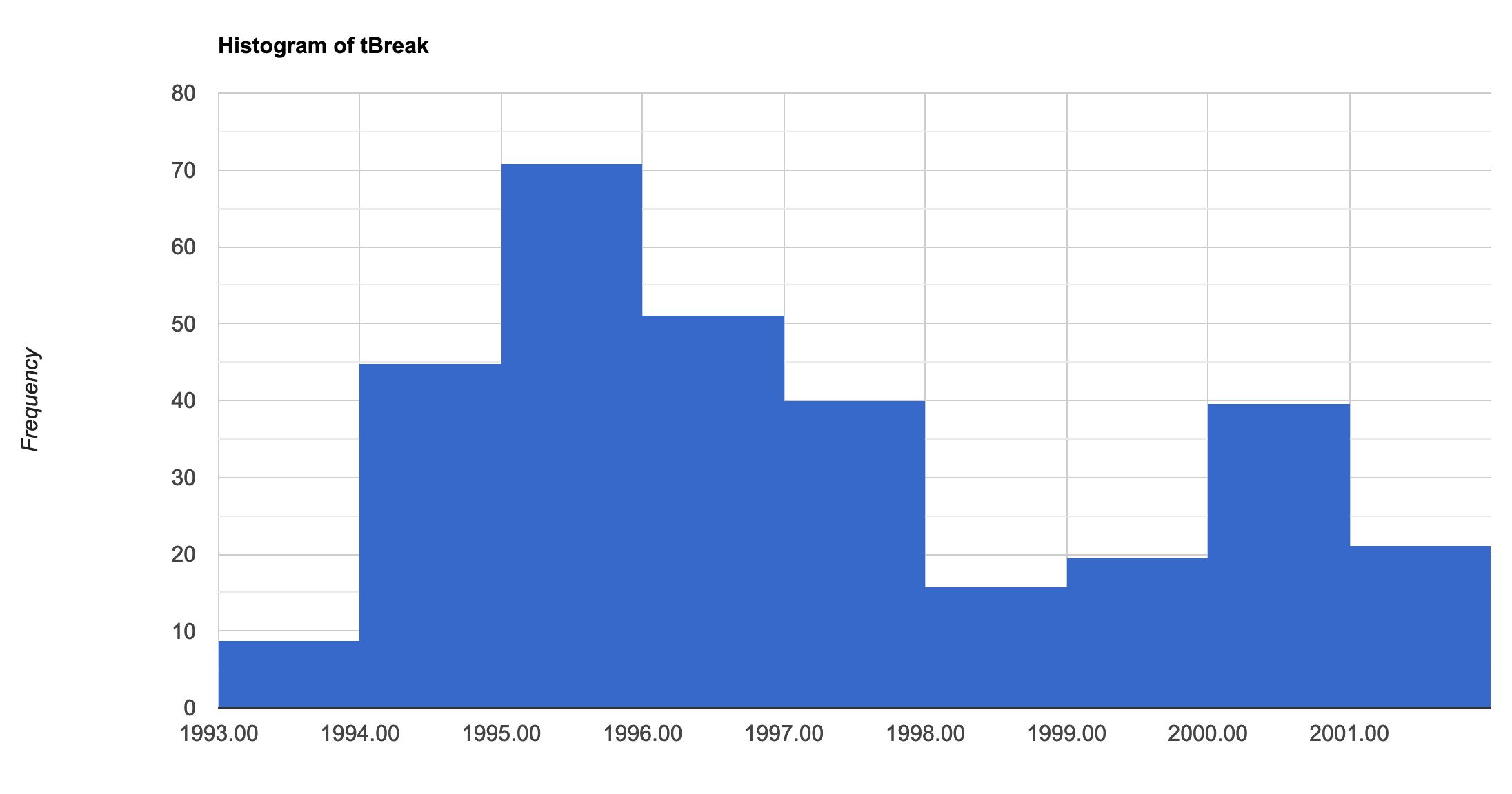 Histogram showing the distribution of the date of biggest change.