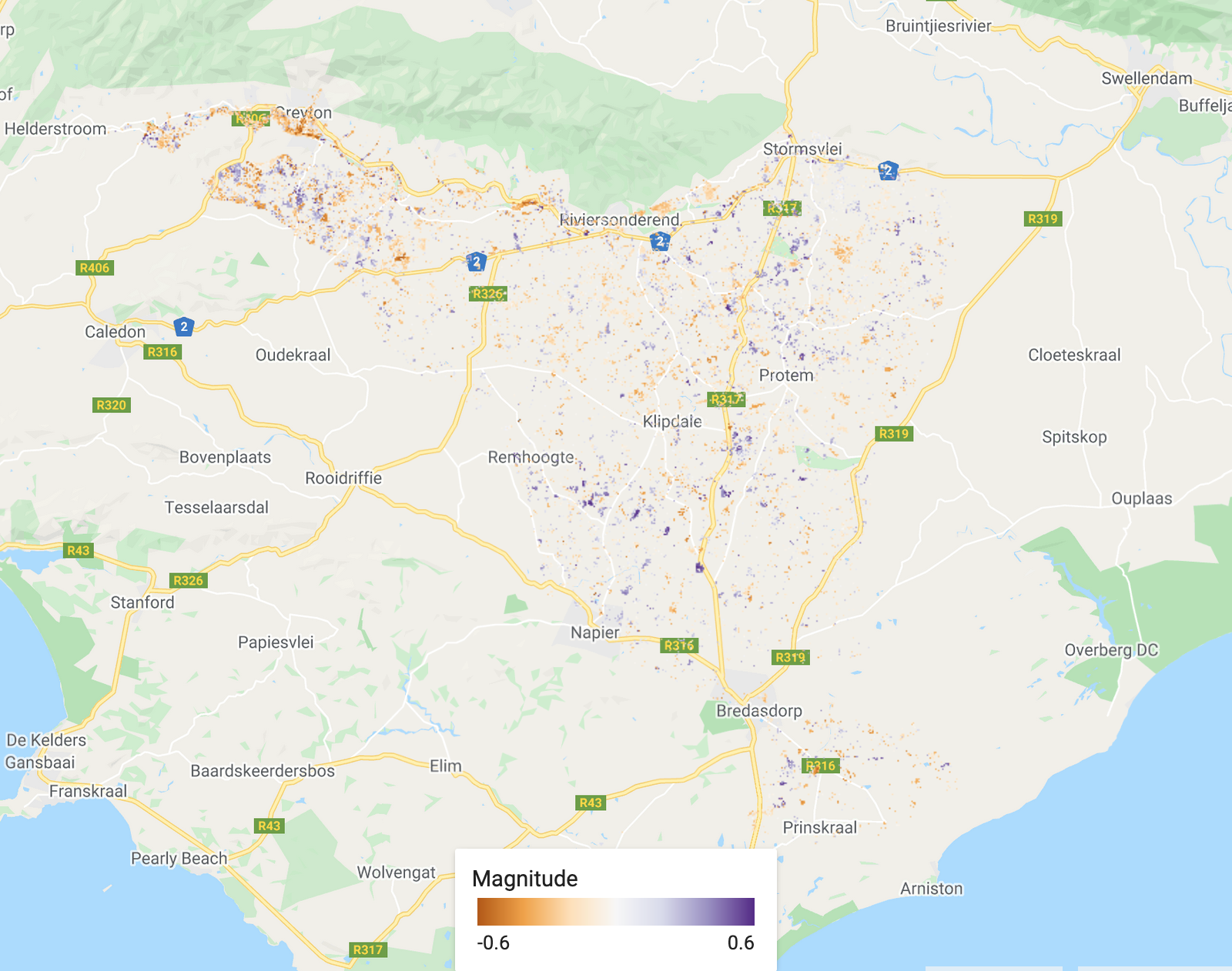The magnitude of the biggest change. Purple shows a decrease in the chosen band (SWIR1 in this case) and orange shows an increase.